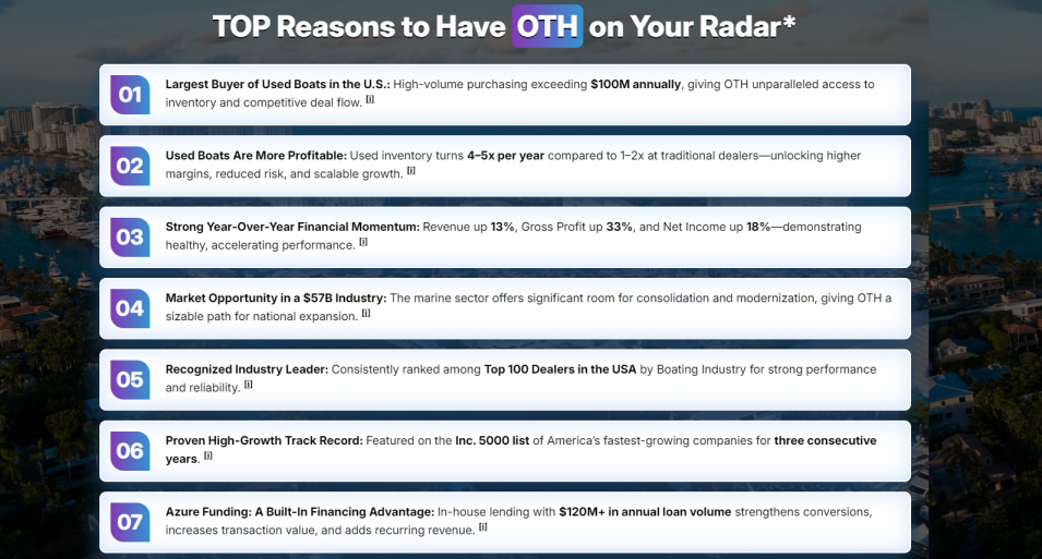 In February 2026, OTH announced a strategic partnership with Jefferson Beach Yacht Sales (JBYS), a premier Michigan-based brokerage with over 50 years of operating history and nine locations across the Great Lakes and Florida.