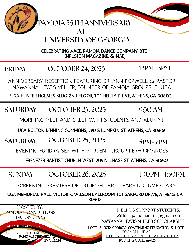 This free three-day weekend, October 24–26, 2025, honors the visionary leadership of Pastor Nawanna Lewis Miller, the trailblazing UGA student whose faith, courage, and creativity in the early 1970s gave birth to five dynamic organizations—Pamoja Singers, Pamoja Dancers, Pamoja Drama and Arts, Pamoja Newspaper, and the Journalism Association of Minorities. Her groundbreaking work in 1970 established a legacy of cultural camaraderie, performance, and empowerment that continues to uplift students today.